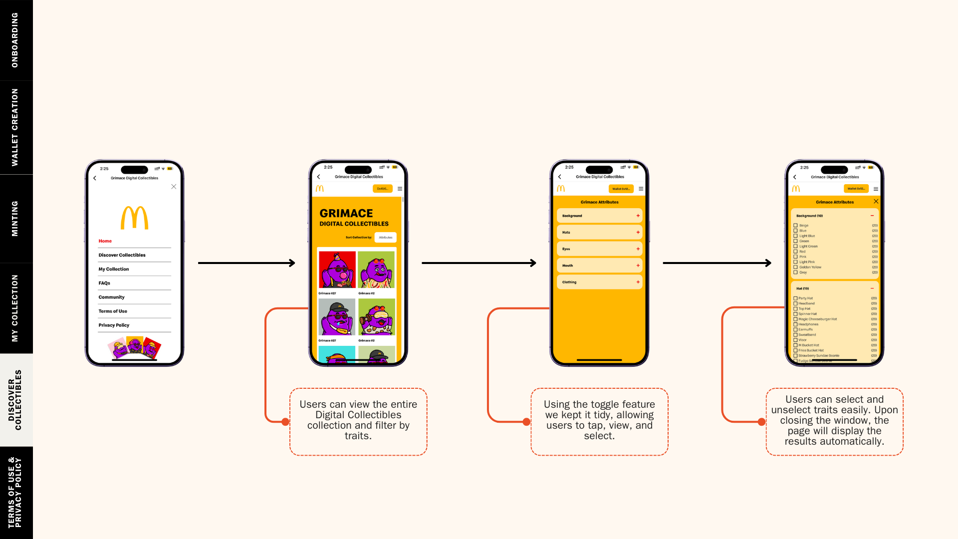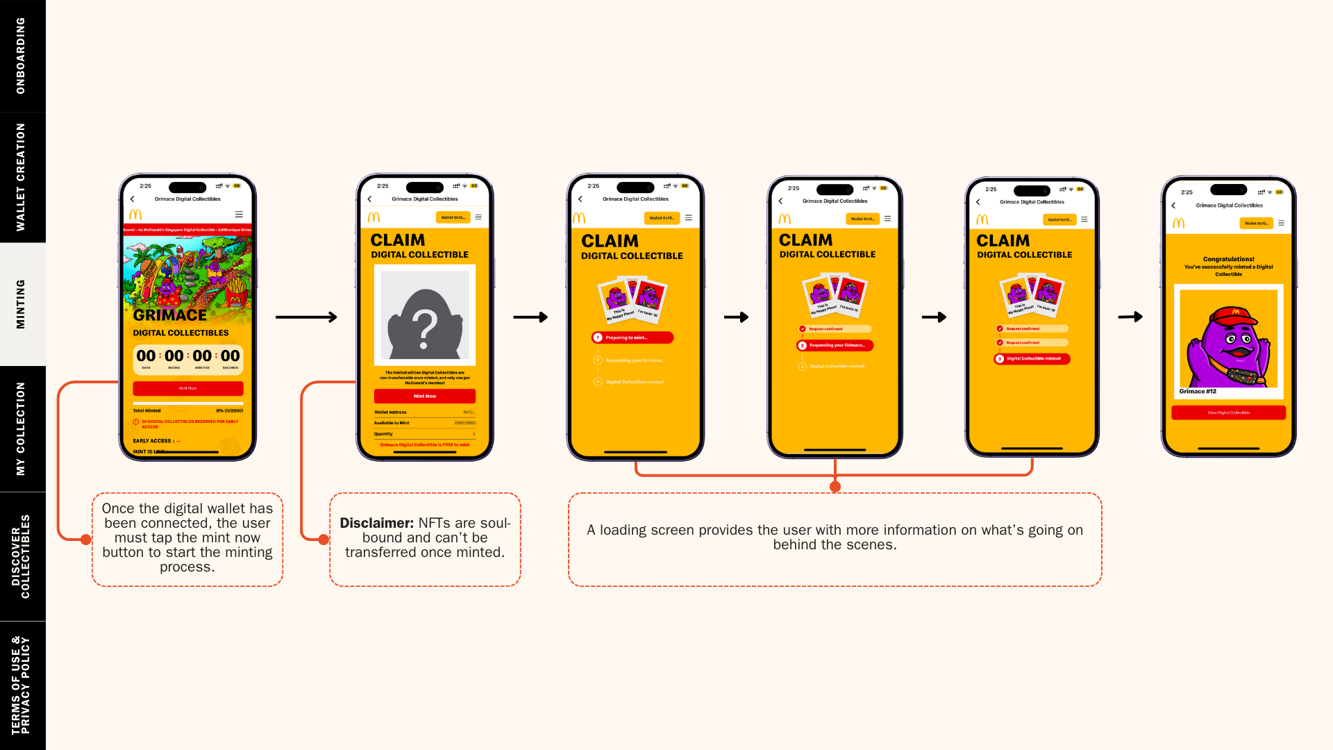 Most NFT minting require users to go to external platforms like OpensSea or Magic Eden. However, those platforms feature many other collections and feel too foreign for non-web3 users. To ensure that the Digital Collectibles are accessible to both non-Web3 and Web3 natives alike, McDonald’s needed a solution which was seamless and accessible through the McDonald’s app, and any utility should be claimed through the same app instantly as well.