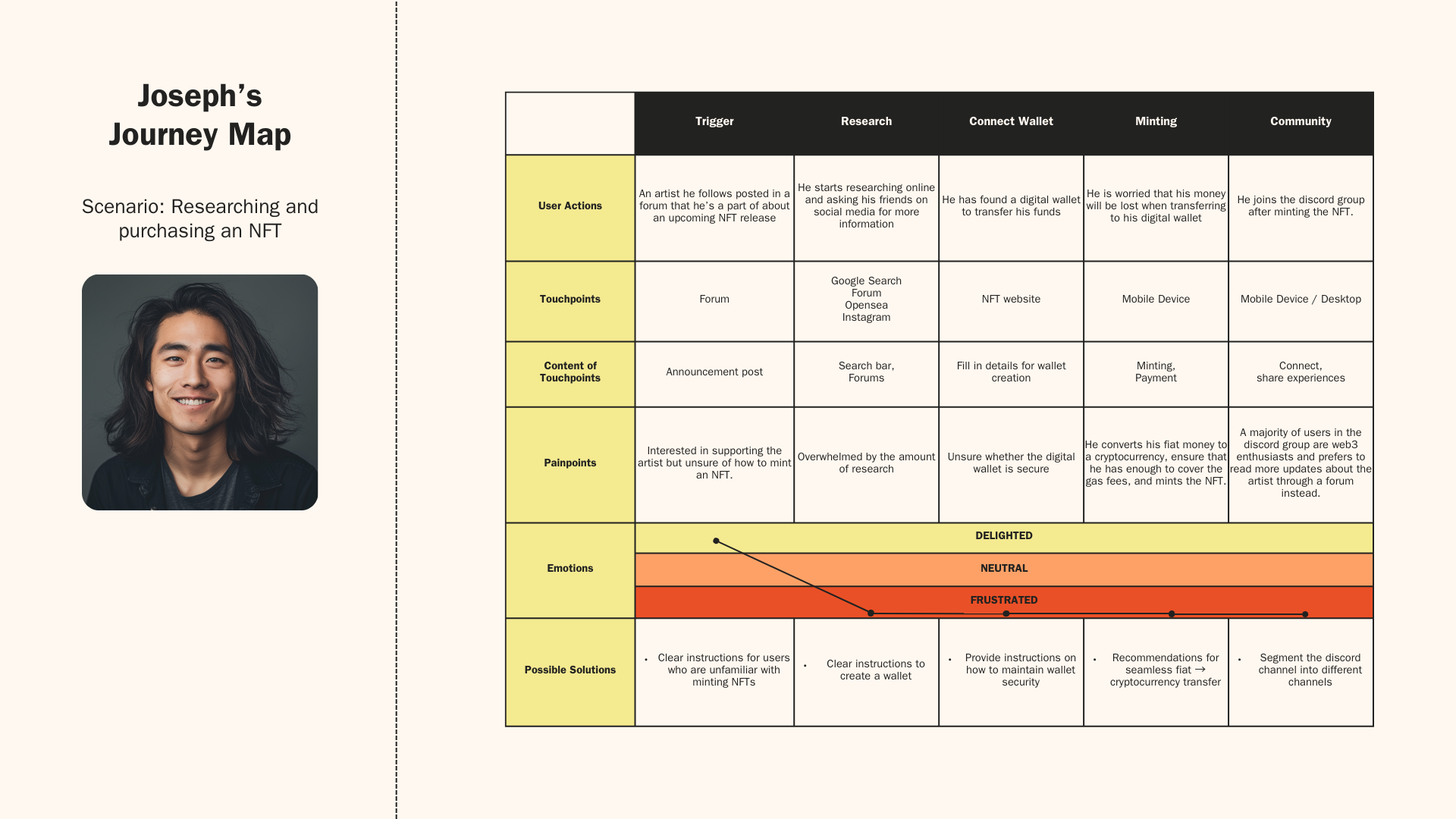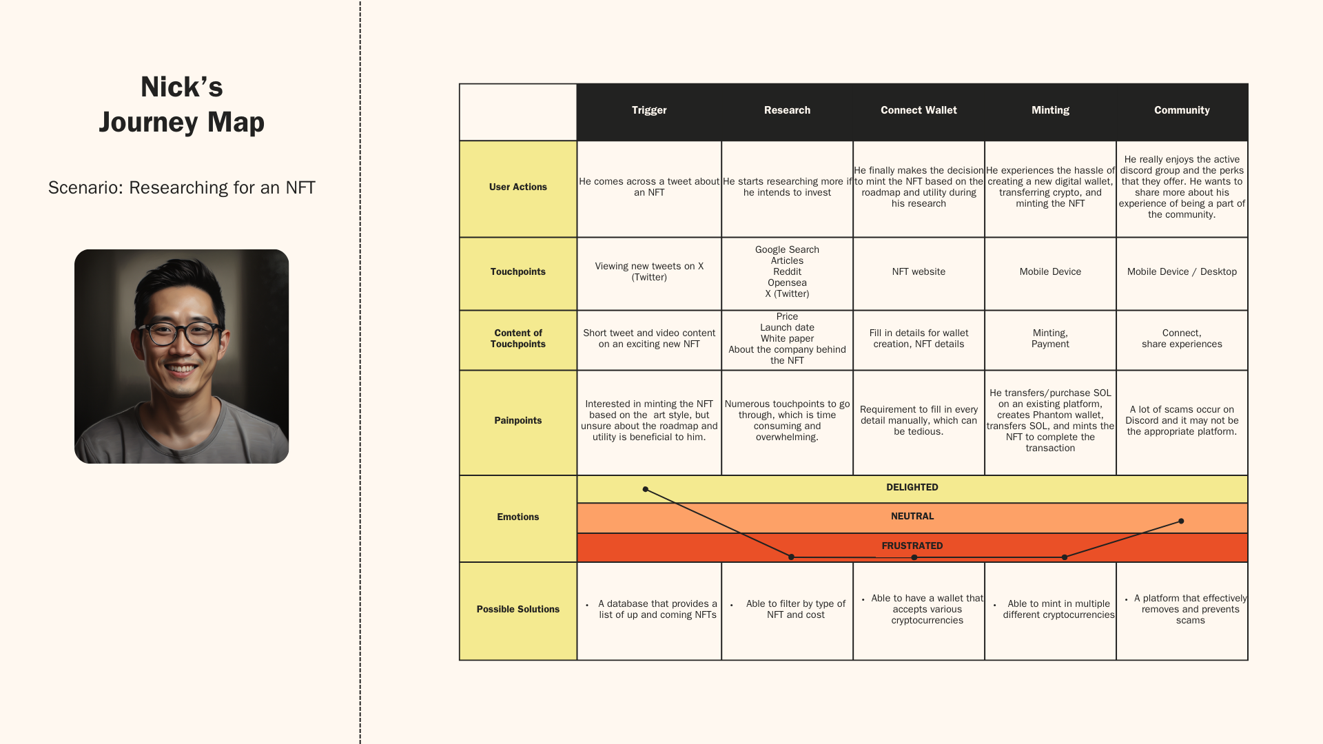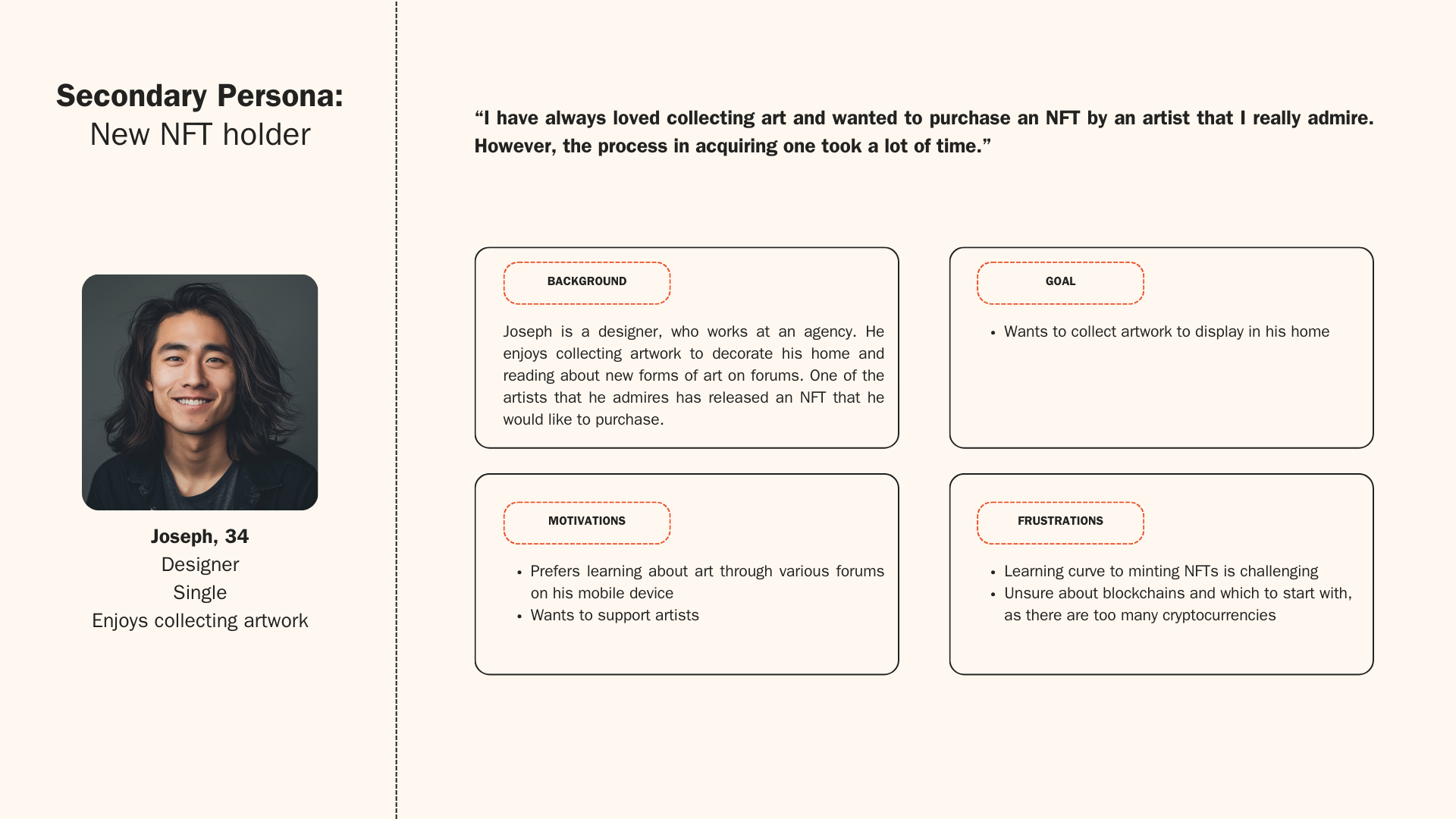 The secondary persona includes users who might lack a starting point for their NFT research or feel unsure about how to mint an NFT.