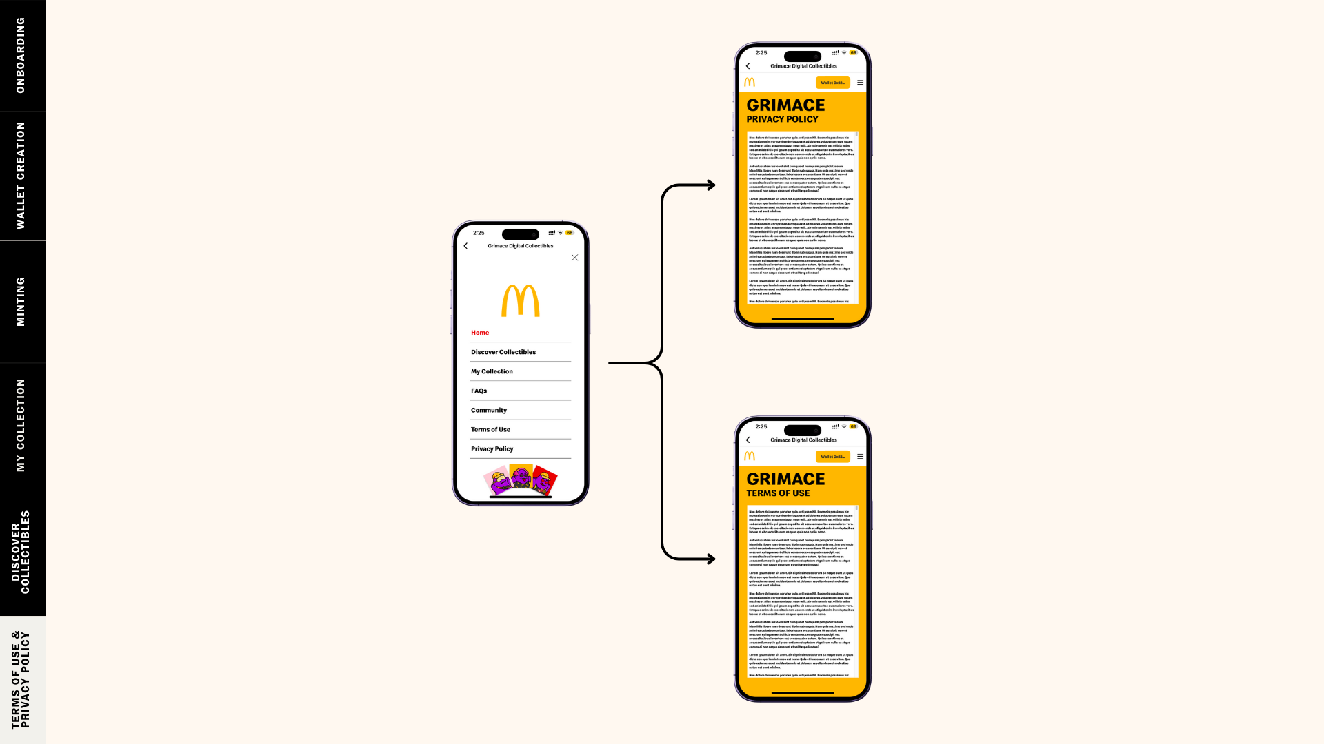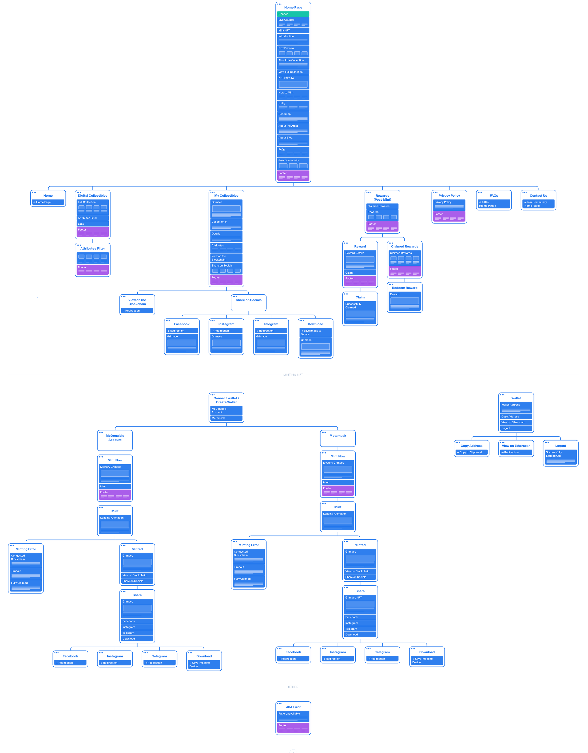 A sitemap was created with a structure comprising five sections: Homepage, Collectibles, Perks Page, Terms of Use, and Privacy Policy. The best technology works silently, under the hood. Users should not be required to have technical knowledge nor go through complex workflows. “It just works” is the mantra of the best web applications and we achieved that with the minting process.