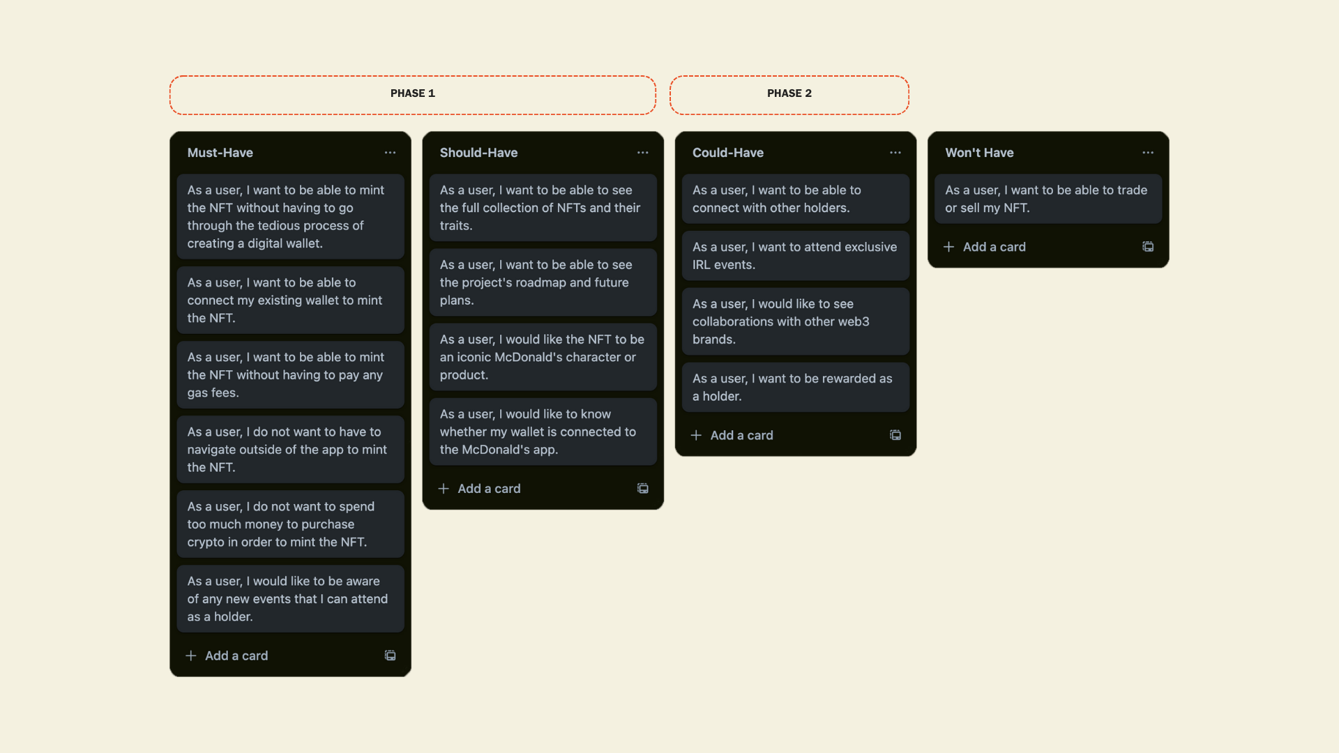Phase 2: This would focus on the 'Could-Haves' meant for exploration in a subsequent product development phase. It would cover extra features that piqued the interest of users during the research, going beyond the utility of the NFT. These include opportunities like attending exclusive in-person events, partnering with web3 brands, and enhancing community engagement by providing a platform for users to connect and share their experiences.