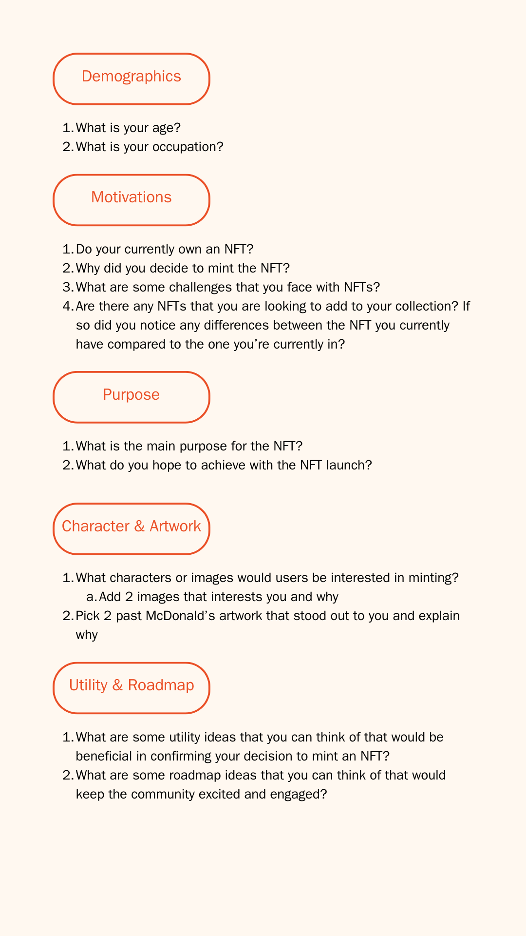 I conducted user research by hosting a focus group session involving Superfans and Crew members through the platform Miro, with a focus on gathering qualitative insights. The objective was to gain a deeper understanding of the factors influencing users' decisions when considering investment in an NFT, including aspects like the community, roadmap, utility, and design that are taken into account when exploring potential NFT communities.