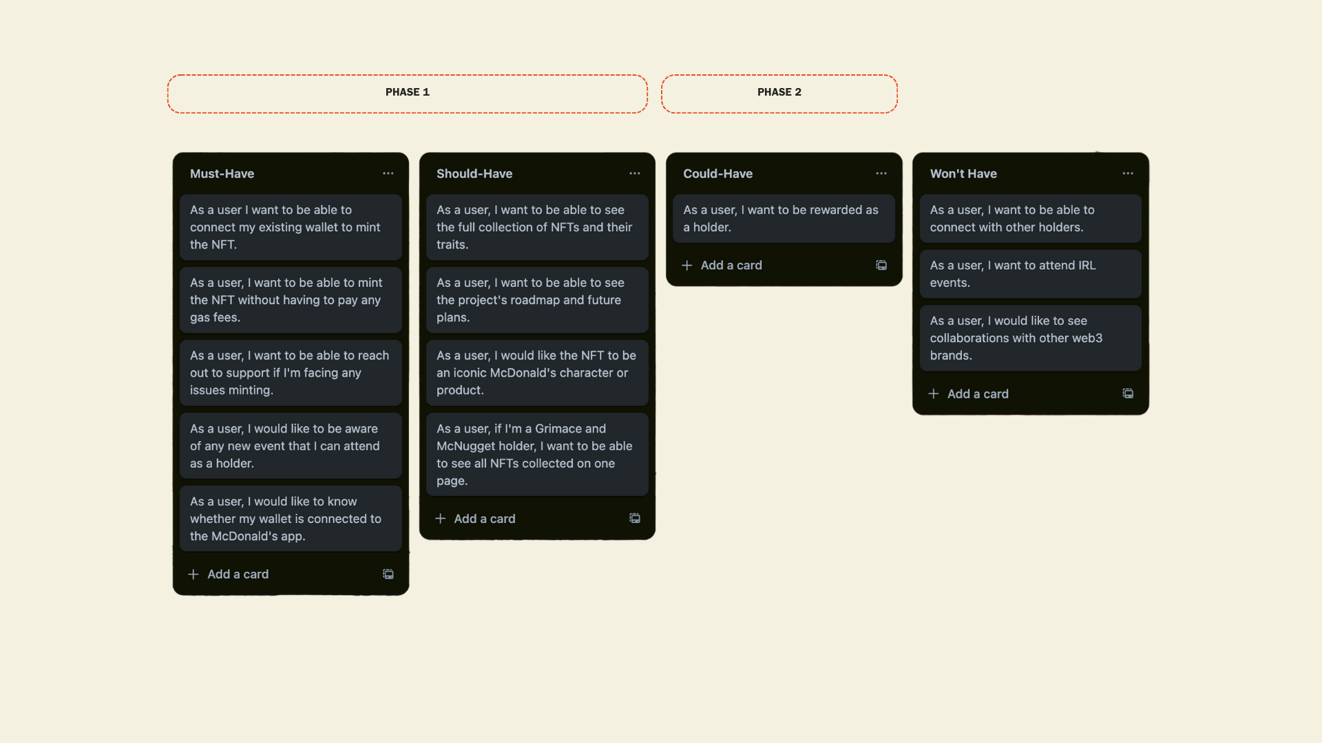 Phase 2: This would focus on the 'Could-Haves' meant for exploration in a subsequent product development phase. It would cover extra features that piqued the interest of users during the research. These include opportunities like being rewarded with exclusive perks, only available for McNugget holders.