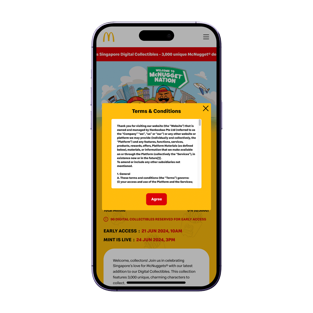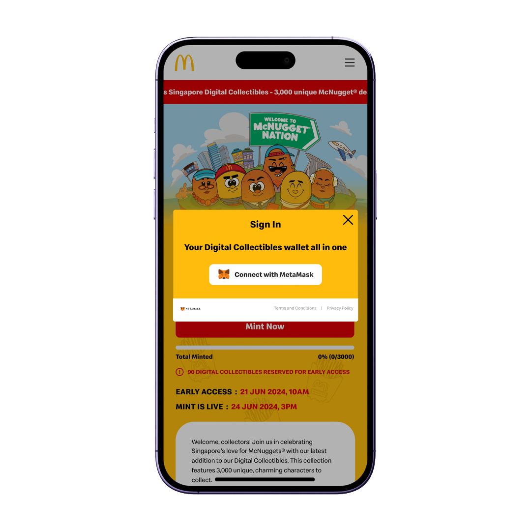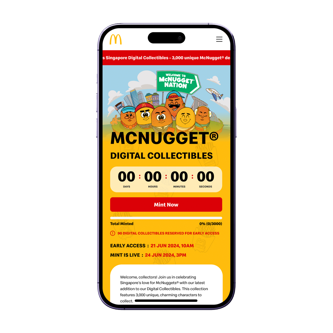 During the month of June, McDonald's ran a McNuggets campaign, seizing the chance to unveil their next Digital Collectible - the exclusive limited collection of 3,000 NFTs featuring their beloved menu item, McNuggets! Crafted by the local creative agency, Tell Your Children, this Digital Collectible offered a unique opportunity for users to join the expanding circle of holders, especially those who missed out on minting the Grimace Digital Collectible. The NFT launchpad functioned within the web app browser on the McDonald's Singapore app.