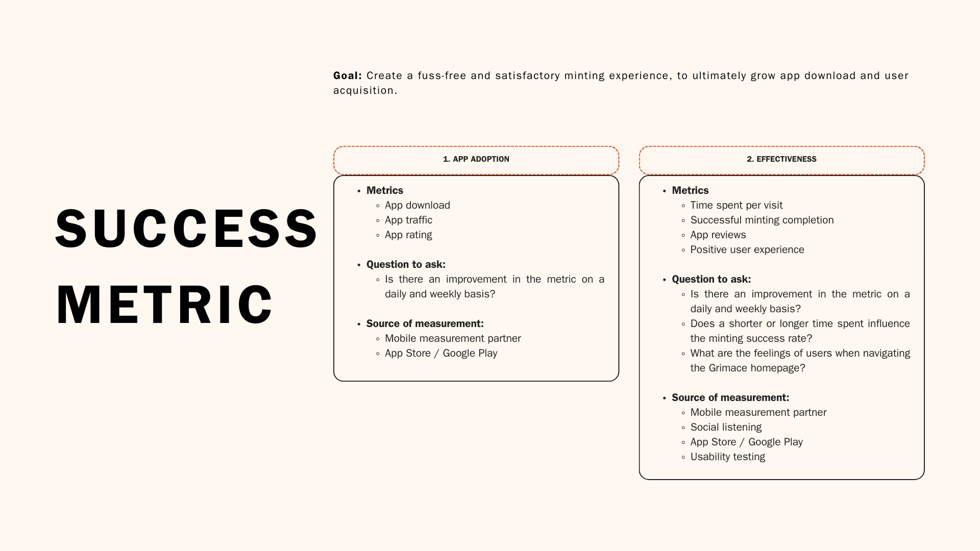In the concluding phase of my project, I established criteria to gauge the extent to which the launch pad has effectively delivered a smooth user experience. The main measure of success is determined by the time taken to fully mint the collection, with app usage efficiency serving as the secondary metric of success.