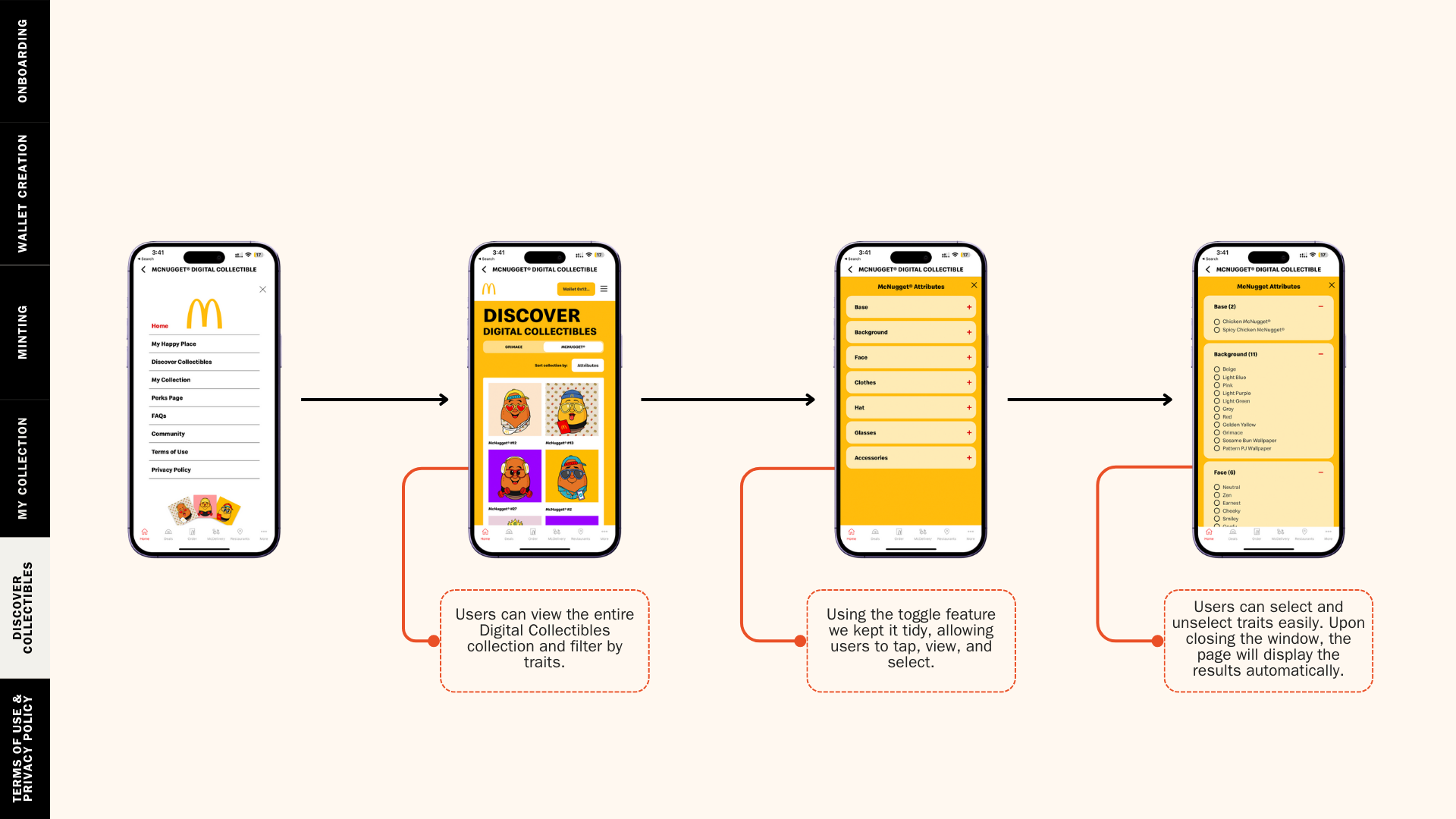 Drawing inspiration from McDonald’s clean design for its trusted and easy-to-navigate interface, the design also integrated playful elements to cultivate a welcoming and amicable look and feel. Please refer to Grimace Digital Collectibles case study here for the re-used design principles and design system.
