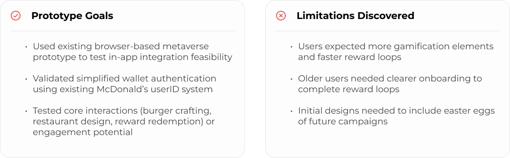 Lead product designer across the full project lifecycle. I identified the market gap, defined the core hypothesis, led competitive platform research, facilitated focus groups with McDonald's crew and superfans, designed all interactive zones and user flows, iterated through 3 distinct phases of development, and managed app integration testing alongside the engineering team. I owned design decisions from world architecture to reward redemption UX.