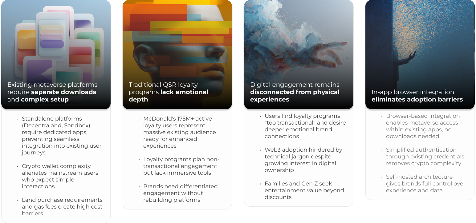 Existing metaverse platforms like Decentraland and The Sandbox required complex crypto wallet setups, separate downloads, and virtual land purchases costing up to $12,000 per parcel, making them inaccessible to mainstream QSR audiences. Meanwhile, traditional loyalty programs were purely transactional, offering no emotional connection beyond discounts. There was no accessible, brand-owned solution that bridged immersive digital engagement with real-world value.