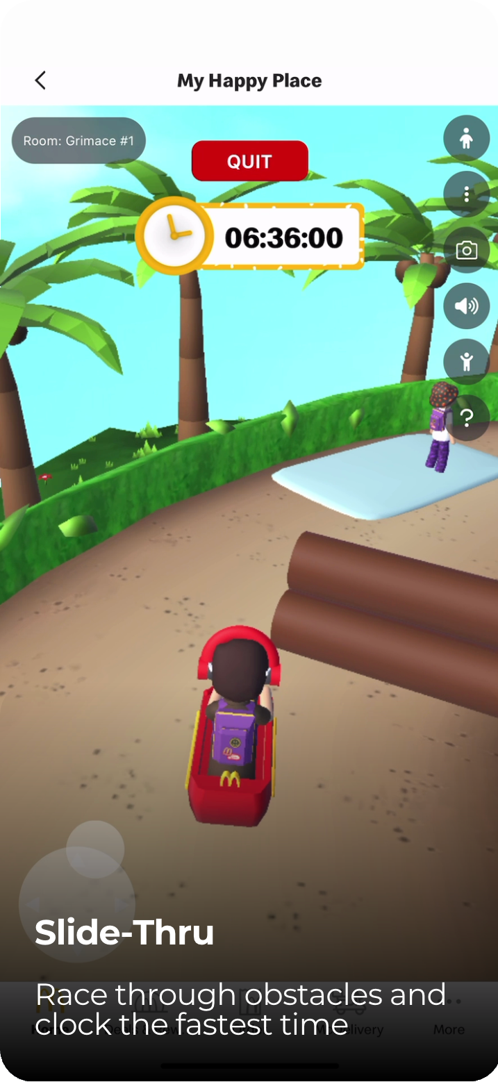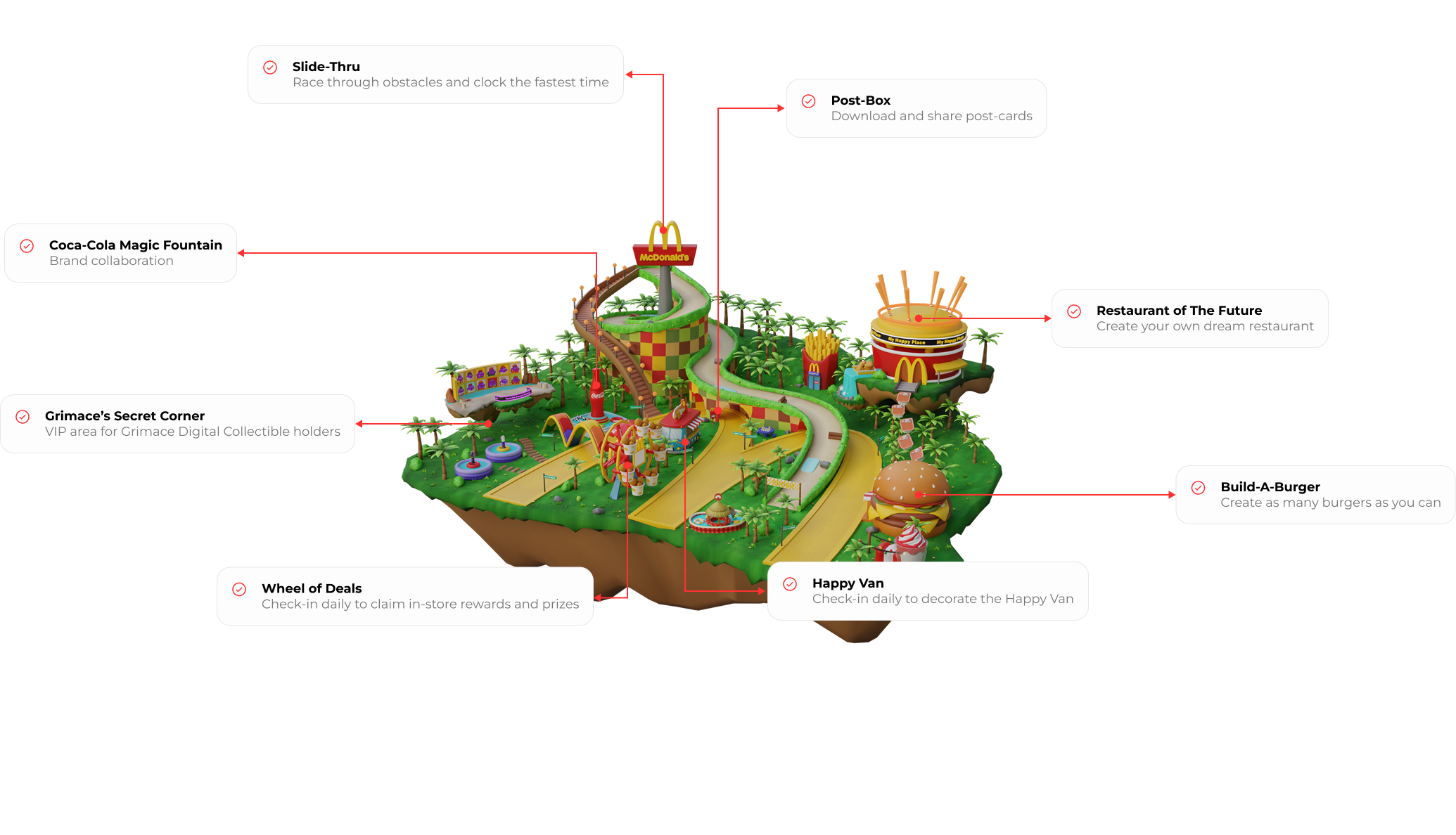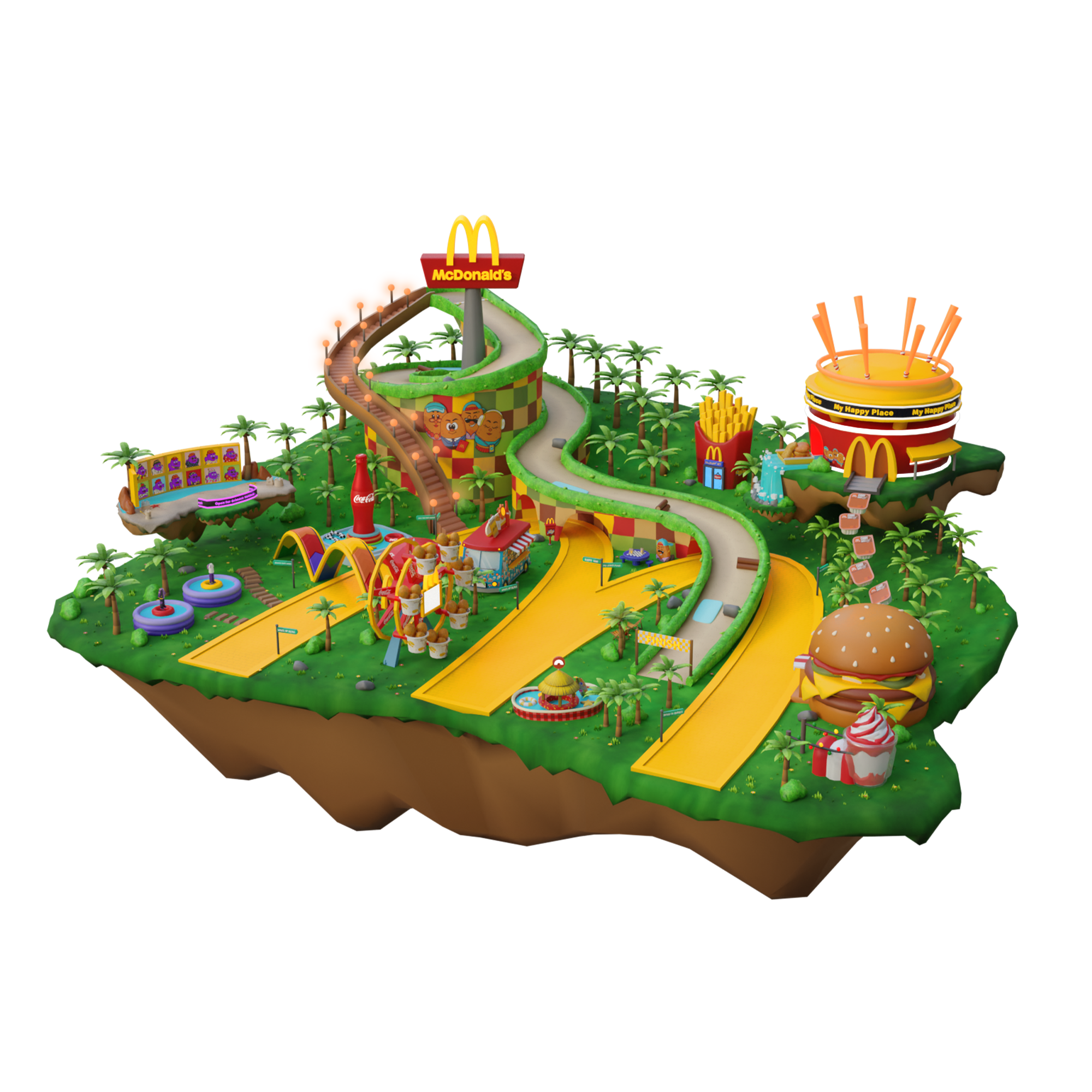 The My Happy Place metaverse represents the idea of joyful exploration and familiar comfort. The world design balances playful fantasy with McDonald's iconic brand elements, creating spaces where users feel invited to discover, play, and return. Each area embodies a specific aspect of the McDonald's experience, transforming brand touchpoints into interactive destinations that spark curiosity and engagement.