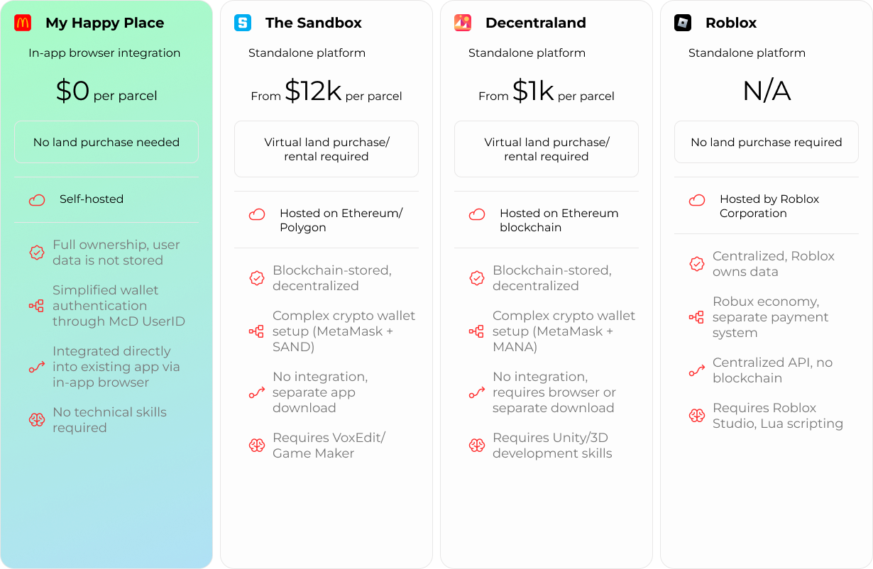 Pricing data was sourced from each platform's published land marketplace at time of research. The $0 per parcel figure for My Happy Place reflects the self-hosted, browser-integrated architecture proposed as the solution, eliminating virtual land acquisition entirely. This analysis directly informed the decision to pursue in-app browser integration over any standalone metaverse platform deployment.