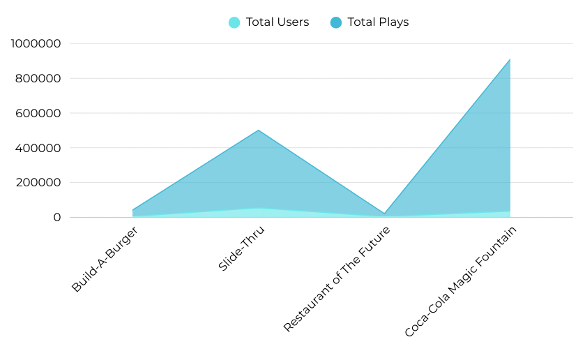 The Coca-Cola Magic Fountain (874,629 gameplays) and Slide-Thru (23.5% participation rate) dramatically outperformed single-player experiences.