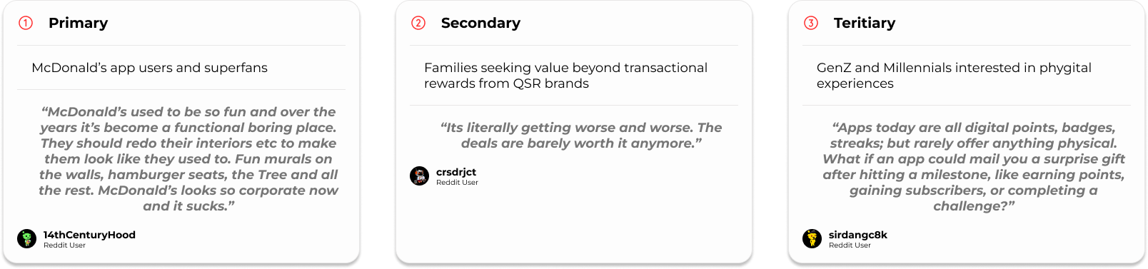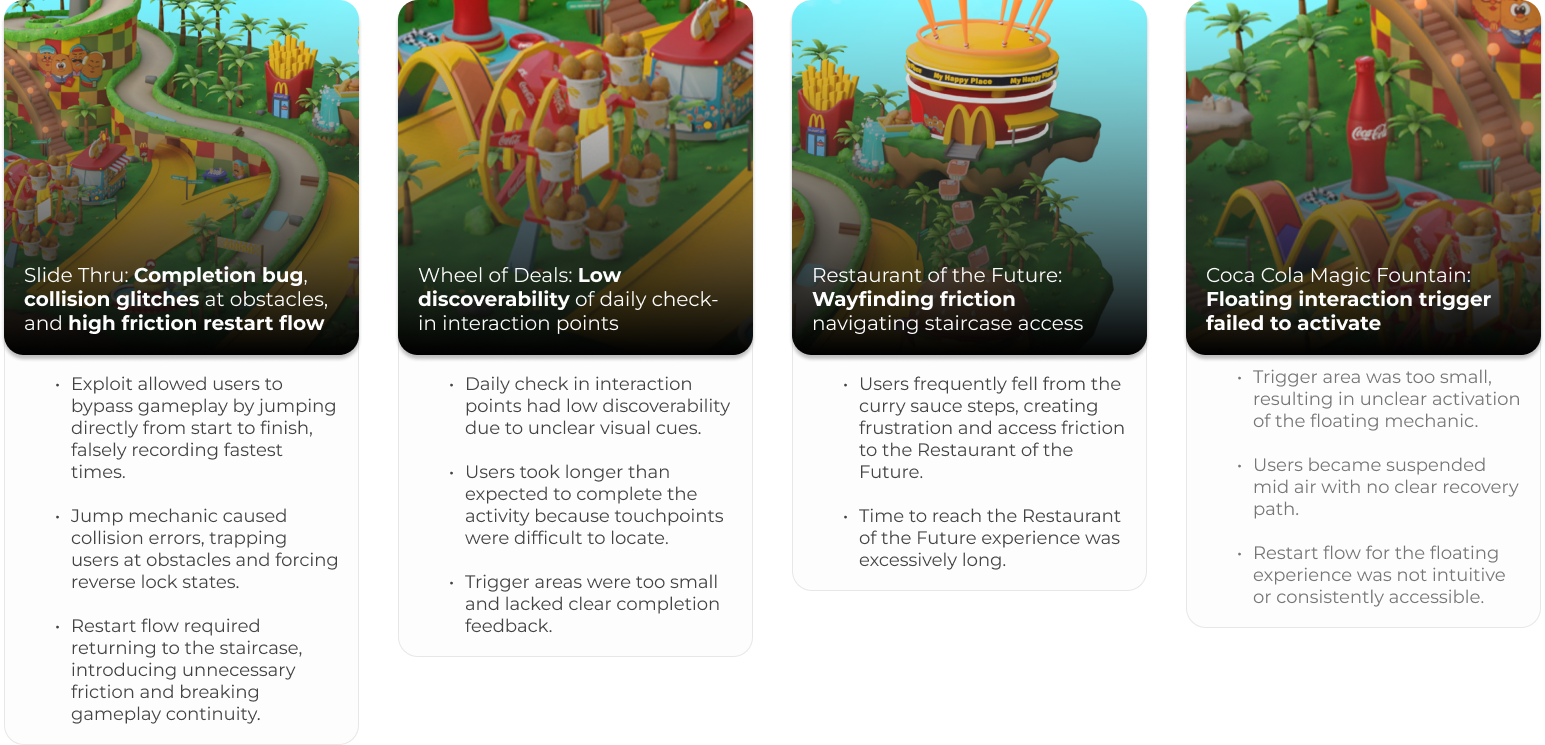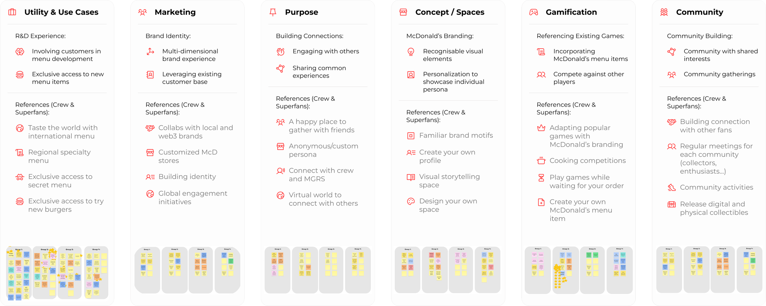 Feedback from McDonald's crew and superfans was synthesized into the core world design of My Happy Place, ensuring each interactive zone addressed both user expectations and McDonald's business objectives. Every design decision mapped directly to themes surfaced during focus group sessions, translating raw participant input into purposeful product features that balanced brand integrity with immersive engagement.