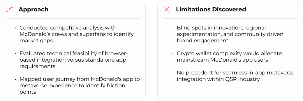 This competitive analysis was conducted in Q4 2023 through a combination of primary platform testing and secondary research. Each platform, Roblox, The Sandbox, and Decentraland was evaluated firsthand against six criteria directly relevant to McDonald's requirements: deployment cost, hosting model, data ownership structure, authentication complexity, integration feasibility with existing app infrastructure, and the technical skill required to build and maintain the experience.
