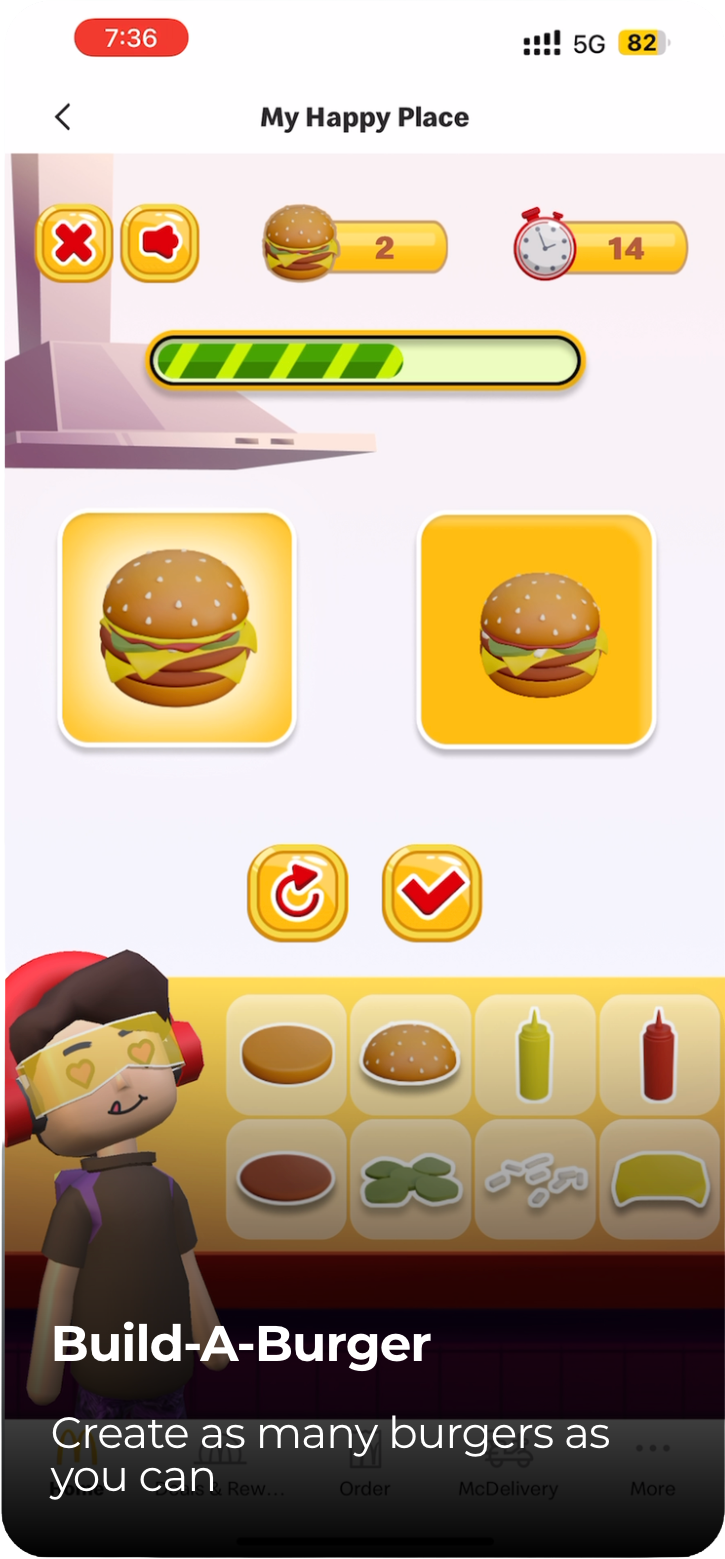 Gameplay variations were strategically tied to the Wheel of Deals to increase visits and drive repeated interactions. A mix of single-player and multi-player mechanics was introduced to appeal to different user motivations, from individual exploration to friendly competition. Each experience was purposefully designed to spotlight the LTO burger, inspire future restaurant design concepts, and create competitive dynamics that encouraged replay.