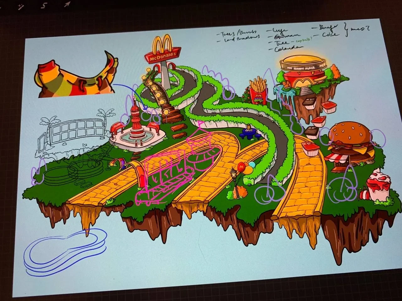 Early rough sketchThe interconnected zones act as experience hubs, each offering distinct activities while maintaining visual and thematic coherence. From the Slide-Thru's dynamic racing game to the Coca-Cola Magic Fountain's element of surprise, the world architecture guides users through varied experiences with intuitive wayfinding and clear purpose. The spatial design balances open exploration with directed activities, ensuring users can navigate freely while always finding something meaningful to do.